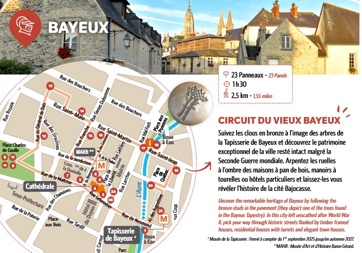 Suivez les clous en bronze à l'image de la Tapisserie de Bayeux et découvrez le patrimoine exceptionnel de la ville resté intact malgré la Seconde Guerre mondial. Arpentez les ruelles à l'ombre des maisons à pan de bois, manoirs à tourelles ou hôtels particuliers et laissez-les vous révéler l'histoire de la cité Bajocasse.